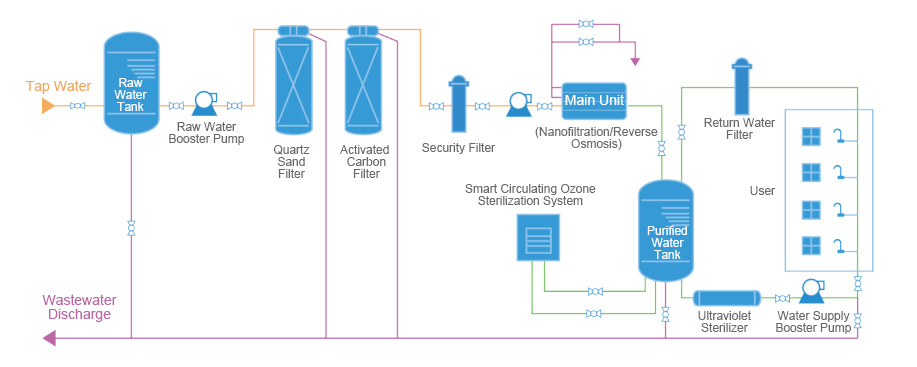 Drinking water treatment stations and water purification equipment are widely used in various settings such as factories, office buildings, schools, and commercial areas. Depending on the water source and requirements, it typically includes multiple water purification processes such as nanofiltration, reverse osmosis, ozone, and dual automated UV sterilization, effectively removing bacteria, viruses, harmful substances, and heavy metals to ensure water quality complies with CJ94 "Water quality standards for fine drinking water". It is equipped with an intelligent monitoring system to track water quality changes and equipment status in real time, ensuring stable and continuous operation.